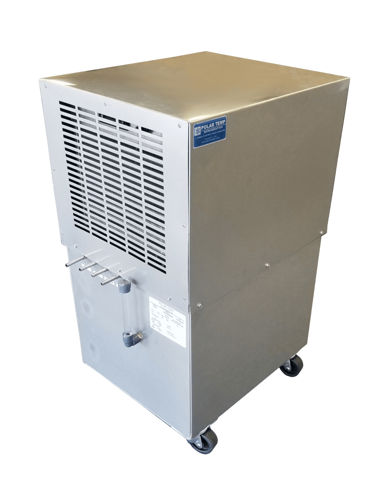 The Polar Temp Water Chiller (PTWC) is a water conditioning unit designed to deliver a steady supply of cold water. This water chiller is ideal for using for both general and industrial machinery cooling use. Dimensions are 19.5″ long by 15.5″ wide by 30.5″ high. The PTWC efficiently reduces water temperature from 70°F to around 51°F in just one minute at a 1.6 GPM flow rate through 100 feet of stainless-steel tubing.